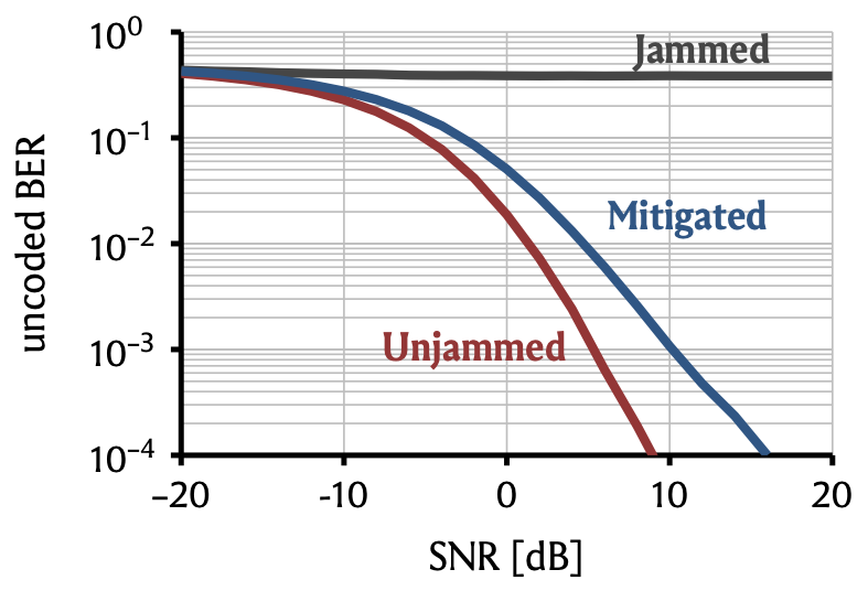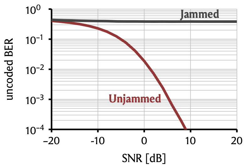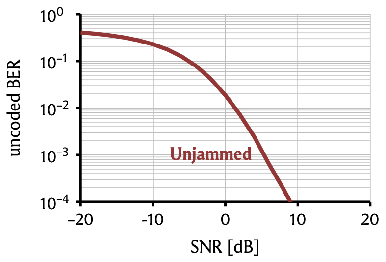 But it is not quite as good as the jammerless system: To reach a BER of \(0.1\)%, we need roughly \(5\,\)dB higher SNR. Why?
